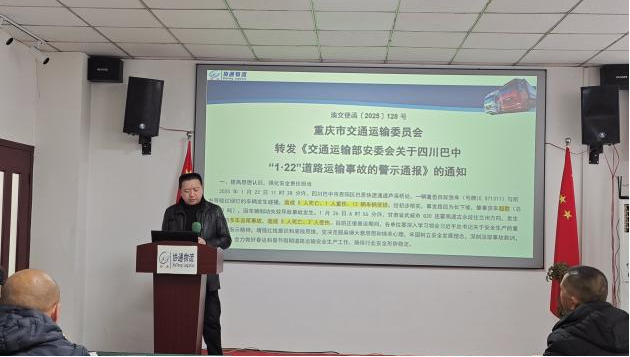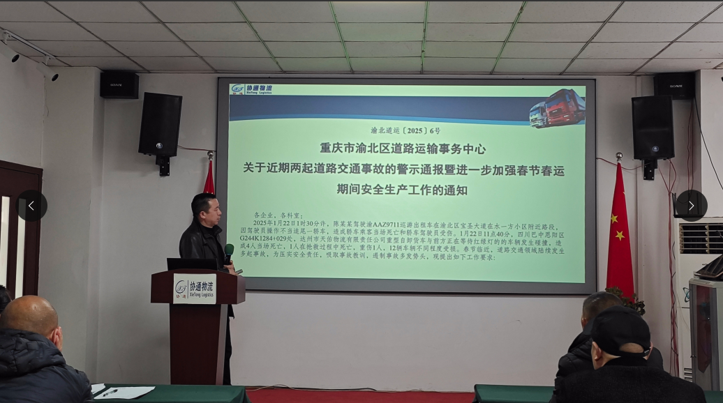總經理唐云忠首先傳達上級部門及公司各項文件精神。傳達了渝交便函〔2025〕119 號重慶市交通運輸委員會轉發《交通運輸部安委會關于福建漳州“1·16”客車自燃險情的警示通報》的通知;傳達了渝交便函〔2025〕128 號重慶市交通運輸委員會轉發《交通運輸部安委會關于四川巴中“1·22”道路運輸事故的警示通報》的通知;傳達了渝北道運〔2025〕6號重慶市渝北區道路運輸事務中心關于近期兩起道路交通事故的警示通報暨進一步加強春節春運期間安全生產工作的通知;傳達了渝北道運〔2025〕7號重慶市渝北區道路運輸事務中心關于切實做好春運后半段道路運輸暨復工復產復運安全工作的通知;傳達了渝北交〔2025〕9 號重慶市渝北區交通運輸委員會關于對 2024 年度全區交通運輸行業安全生產工作成績突出單位予以激勵的通報;傳達了重慶協通國際物流有限公司《安全生產獎懲制度》等文件精神,要求全體員工認真按照上級文件精神做好安全生產各項工作。